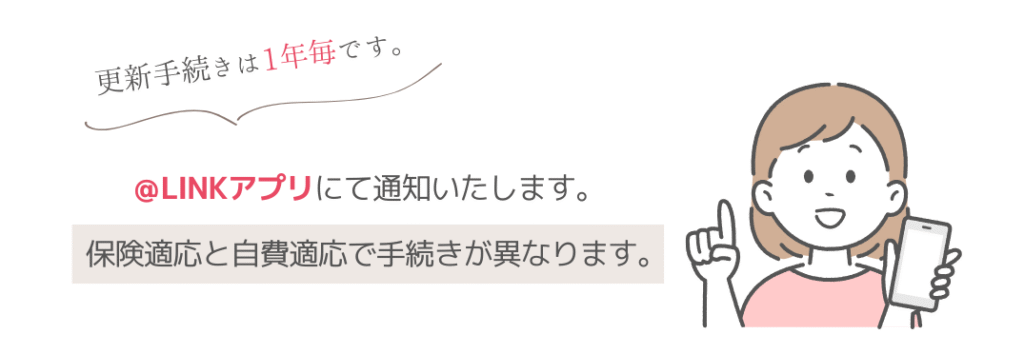 ※現在妊娠中の方は、保険での治療が中断となるため、更新は自費となります。