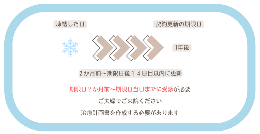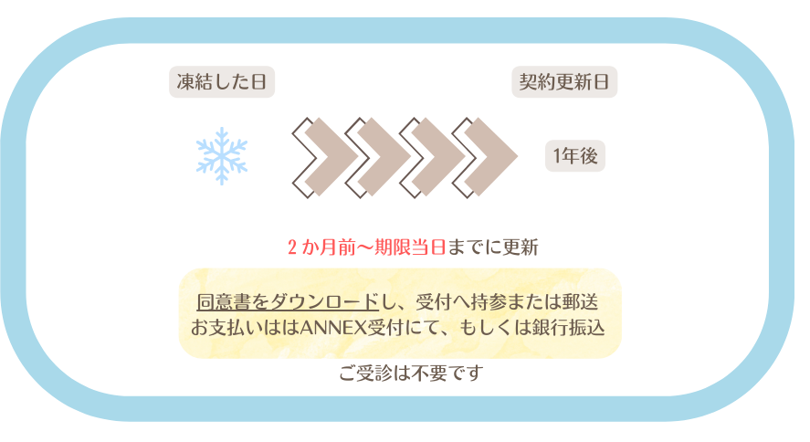 • 診察をした上で、凍結保存期限日翌日~14日以内に更新を行います。